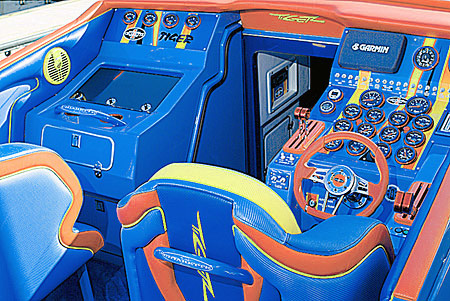Успешный опыт эксплуатации Cigarette 42'Tiger TS, одержавшей немало побед в любительских и профессиональных соревнованиях, привел к появлению модели 42' Tiger XP. Это, так сказать, тюнинг чистой воды, выполненный инженерами Cigarette в соответствии с пожеланиями владельцев пестрой 42-футовой торпеды. Подвергшаяся легкой «пластической операции» 13-метровая красавица весом более четырех тонн имеет очень изящный, жесткий корпус с усиленной вакуумной прокладкой и толщиной днища в один, а кормы – в три четверти дюйма. Он изготовлен с активным использованием бальзы и материалов на основе этого быстрорастущего дерева. Так, например, для перегородок корпуса Cigarette традиционно использует легкий и прочный материал Baltec Decolite. Призменные продольные стрингеры, армированные углеродным волокном, имеют «начинку» из вспененной массы. Однако такая конструкция применена не повсеместно – в моторном отделении эти несущие элементы выполнены из дерева. Транцевая часть состоит из воздушно-ячеистых секций. Корпус и палуба стыкуются болтами с использованием эластичного уплотнителя. Эстетическое совершенство корпуса 42' Tiger XP – изумительная чистота поверхности и безупречное лакокрасочное покрытие – является следствием широкого применения ручного труда. Характерная для лодок Cigarette трехступенчатая конфигурация днища обеспечивает оптимальный угол атаки и незначительный, не превышающий двух градусов, подъем носовой части корпуса. Благодаря воздушной подушке лодка идет плавно на предельной скорости, сохраняя способность к энергичному маневрированию даже при значительном возмущении. Стремление к снижению веса не оказало негативного влияния на мореходность – лодка устойчиво держится на волне. «Совершенствуя обводы днища, мы улучшаем динамику, не полагаясь исключительно на увеличение потенциала двигателей», – констатирует один из ведущих разработчиков и вице-президент компании Нил Хернандес. Раздельные кресла капитана и сидящего слева пассажира, в соответствии с классом лодки зачастую выполняющего функцию штурмана, установлены на алюминиевых каркасах и легко снимаются. Кресла имеют развитую боковую поддержку и регулируются по высоте, что максимально упрощает управление Tiger 42' XP в положении стоя. Снабженное гидроусилителем рулевое управление Mayfair отличается умеренной «остротой», вполне адекватной габаритам лодки. Приборы Gaffrig с белыми циферблатами и красными стрелками выдают полную информацию о состоянии всех систем. Они заключены в массивные окрашенные окантовки и легко читаются благодаря оптимальному углу наклона. Здесь представлены заполненный жидкостью спидометр, тахометр, датчики давления и температуры воды, манометр для отслеживания работы компрессоров и топливной системы.