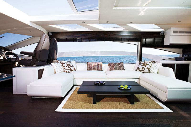Салон главной палубы 78 Fly разделен на несколько зон — пост управления (здесь он расположен слева), столовую и лаунж-зону с низкими диванами и кофейным столиком. Камбуз выделен в отдельную зону и полностью отделен перегородками от остального пространства салона. Попасть на нижнюю палубу можно по двум трапам — мастер-каюта имеет отдельный вход. Это большое помещение от борта до борта, с ванной комнатой и гардеробом. Две гостевые каюты расположены в носовой части нижней палубы, вход туда расположен традиционно рядом с постом управления. Как и положено настоящей семейной яхте, 78 Fly обладает всем необходимым для релаксации — для этого подойдут огромные диваны в кокпите и на носовой палубе. Но все же самое приятное времяпрепровождение нас ждет на флайбридже. Огромная верхняя палуба вмещает все, что нужно, и даже больше — кроме поста управления, здесь есть бар с грилем и мойкой, столовая зона, а также место для принятия солнечных ванн. Здесь же удобно хранить тендер. Для команды на 78 Fly имеется свое собственное помещение с отдельным входом в кормовой части яхты.