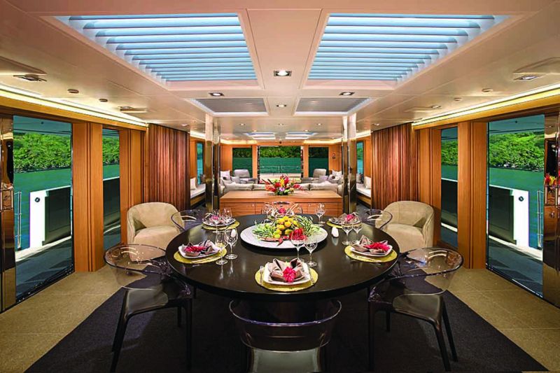 В главном салоне разместился кинозал. На верхней палубе имеются две обеденные зоны — внутри и снаружи. Мастер-суит с библиотекой, балконами и раздельными ванными разместился на главной палубе. Уровнем выше — VIP-каюта с панорамным видом. Четыре гостевые каюты — на нижней палубе. А wellness-зоне с сауной, спортзалом и лаунджем для отдыха отведена целая палуба. Гостям предлагаются блюда от шеф-повара Джеймса Уоллеса, работавшего в мишленовских ресторанах Лондона и Сиднея.