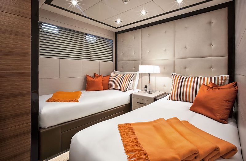 С трех сторон от нижнего салона располагаются каюты. Ближе к корме — каюта владельца во всю ширину корпуса, по правому борту — гостевая каюта с раздельными кроватями, в носовой части — VIP-каюта с двуспальной кроватью. И в мастере, и в VIP-каюте помимо больших кроватей предусмотрены диваны. В мастере есть большой туалетный столик и гардеробная комната. Ванная комната гостевой каюты по правому борту имеет дополнительный вход из нижнего салона и может быть использована в качестве дэйхеда.