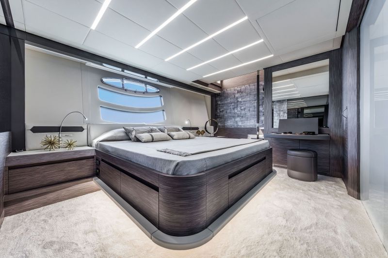 Итак, сразу после насыщенного эмоциями и скоростями дня на воде эта яхта превращается в красивое и комфортабельное пространство для наслаждения панорамными видами. Во всех гостевых зонах Pershing царит атмосфера спокойствия и умиротворения. Темная и светлая древесина дуба с контрастными прожилками в сочетании с темно-серыми лакированными деталями придает изысканности главному салону – просторному, приятному и наполненному воздухом и светом помещению, в котором гости могут почувствовать себя легко и непринужденно, отдыхая в окружении мебели всемирно известной итальянской марки Poltrona Frau. Например, удобно устроившись на огромном кожаном диване Quadra или за деревянным столом Laurana со стеклянной столешницей. Фабрика Poltrona Frau является одним из давних и хорошо известных партнеров верфи, поэтому именно ей было поручено заняться отделкой еще и поста управления. Три эргономичных спортивных кресла для капитана и пары гостей – также работа Poltrona Frau.