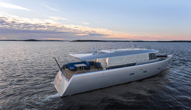 Финская верфь Baltic Yachts, известная быстроходными крейсерскими яхтами вроде Pink Gin VI (статья о ней – в этом же номере журнала), впервые за 20 лет построила моторную яхту. Baltic M78 длиной 24 м получила название Bill & Me в честь ее владельцев, пожилой пары, страстно увлеченной яхтингом, но посчитавшей, что в таком возрасте им необходимы комфорт и остойчивость моторного судна. Хотя M78 лишена мачты и киля, ее морская архитектура и дизайн близки к парусникам, соединяя все лучшее из мира яхт обоих типов. Узкий корпус с вертикальным носом обеспечивает высокую эффективность, позволяя двигателям Volvo IPS 800 разгонять лодку водоизмещением 40 т до 25 узлов. Судно оборудовано гаражом для тендера, откидной платформой для купания, двумя гироскопическими стабилизаторами Seakeeper, камбузом с кухонным лифтом. Надстройка полностью опоясана широкой полосой зеркального остекления. Интерьер – яркий, лаконичный и практичный, как на современном паруснике.