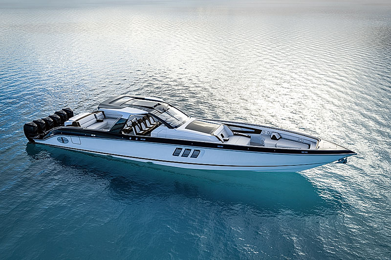Новинка представляет собой 18-метровый скоростной каютный катер с центральным постом управления, хардтопом и шестью подвесными двигателями. Почему только с шестью? «Потому что семь не поместилось», – остроумно отвечают в компании. Помимо выдающихся скоростных качеств, новая Cigarette Tirranna подкупает очень просторным кокпитом. Кроме четырех кресел на посту управления, гости могут разместиться на широких диванах в кормовой и носовой частях лодки, а объемная центральная консоль скрывает в себе жилой модуль с ванной комнатой, камбузом и спальными местами. Шесть Mercury Verado 400R позволяют лодке массой 18143 кг с 3400 литрами топлива и девятью пассажирами на борту развивать скорость 115 км/ч. Аудиосистема Cigarette Pure Extreme с 29 динамиками общей мощностью 5200 ватт обеспечивает достойное музыкальное сопровождение на любых скоростях.