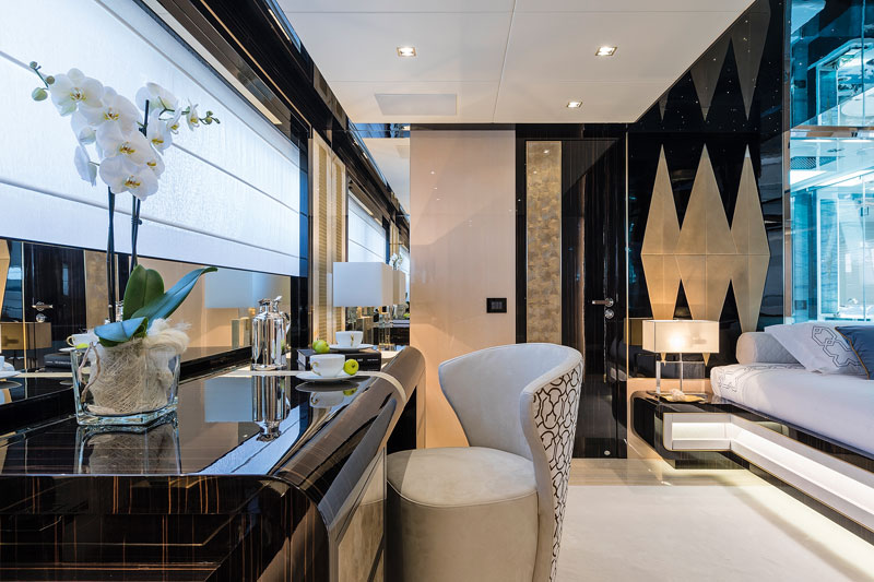 Черное дерево гармонично и элегантно сочетается со светлой древесиной дуба и полированным ясенем, выкрашенным в глубокие синие тона. Одна из самых впечатляющих особенностей интерьера – потрясающе разнообразная, богатая палитра материалов. В одних только гостевых зонах, не считая апартаментов владельца, использовано не менее 11 сортов мрамора и гранита. Буквально каждое помещение, если не каждый уголок яхты, обладают ярко выраженной индивидуальностью.