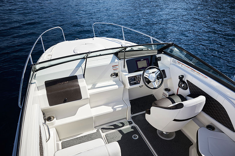 Сидя за штурвалом, можно оценить, насколько Sun Sport 230 эргономичен. Сиденье регулируется, его можно легко настроить, чтобы удобно было вести катер. Спинки сидений капитана и пассажира на посту управления складываются вперед или назад: таким образом можно увеличить место на кокпите во время стоянки. Антибликовое лобовое стекло надежно защищает от встречного ветра и оснащено стеклоочистителем.