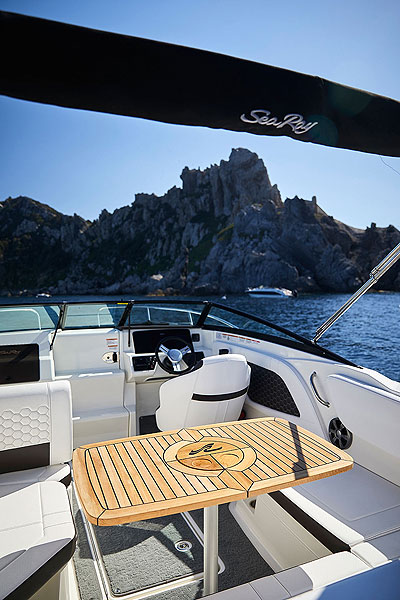 П-образный кокпит рассчитан на семь гостей и обставлен по высокому стандарту Sea Ray: основное пространство занимает круглый стол, к которому как опцию можно добавить еще раскладной прямоугольный. Поручни, а также держатели стаканов удобно расположены. Обивка сидений из добротного винила и детали отделки смотрятся дорого и элегантно. Тент от солнца отлично закрывает кокпит, а в качестве опции доступен съемный ходовой тент-палатка. Каюта с иллюминаторами необычно просторна для такой компактной лодки. Хотя высота под потолком составляет 1,36 метра, можно с комфортом сидеть на V-образной скамье, трансформируемой в двуспальную кровать размерами 1,83×1,80 м.