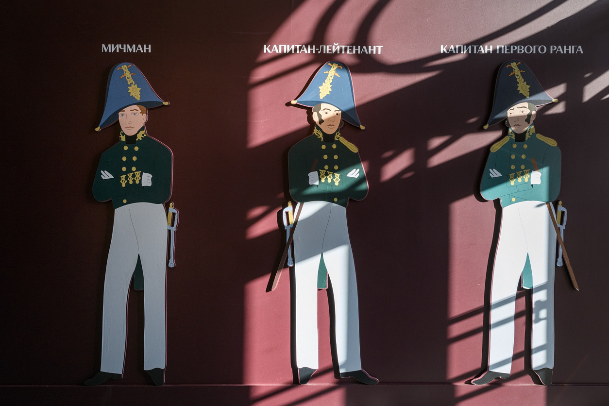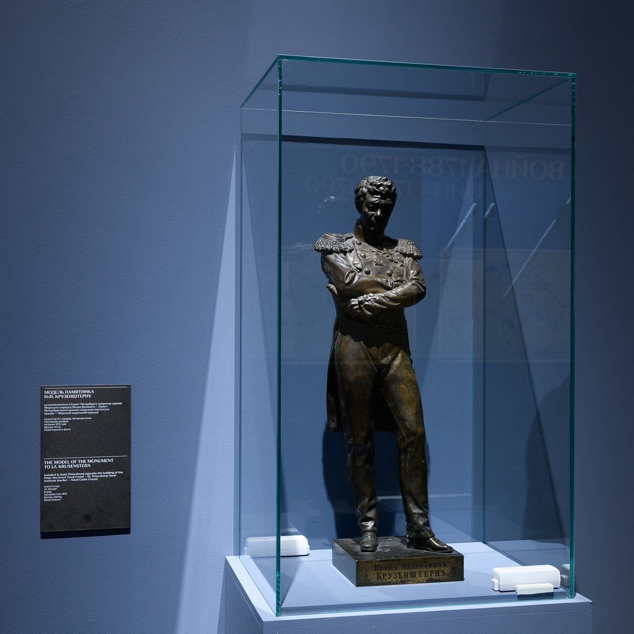«Экспозиция выстроена как диалог человеческого гения и морской стихии, где раскрывается личность Ивана Крузенштерна, сочетающая в себе немецкую основательность и русский авантюризм, — рассказывает художник выставки Юлия Наполова. — В противовес динамике периметра ядро экспозиции, решенное в виде кают-компании, становится камерным пространством. Приглушенные цвета и деликатная отделка оттеняют богатство сокровищ, собранных со всего мира».