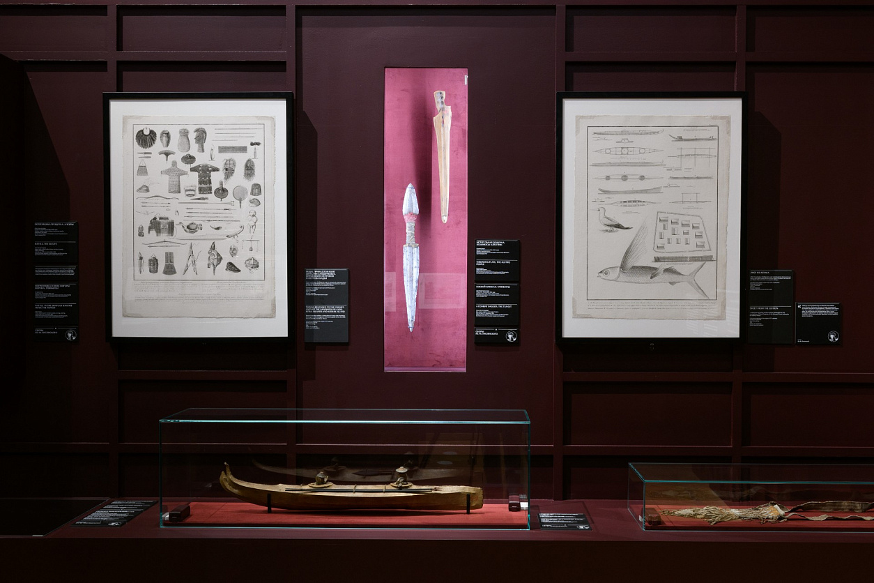 На «Надежде» спасался от наказания за дуэль со смертельным исходом главный скандалист того времени Федор Толстой. Пока у него еще не было ни прозвища Американец, ни татуировок, но от его выходок пострадали многие на борту. Однажды он насмерть напоил священника и припечатал его бороду к палубе корабельной печатью. В другой раз он завел орангутана. Несколько листов путевых заметок капитана обезьяна залила чернилами. Резанов не уставал обвинять своего соперника Крузенштерна в том, что тот пригрел гадюку на погибель всей экспедиции. В итоге авантюриста просто высадили на Камчатке. Впоследствии Пушкин написал эпиграмму на Толстого-Американца: «Ночной разбойник, дуэлист, в Камчатку сослан был, вернулся алеутом». Экспонаты дают понять, какое сильное впечатление на петербуржцев производило это «вернулся алеутом». На выставке представлены модели лодок и предметы быта. Особенно запоминаются боевые и охотничьи головные уборы в виде голов животных.
