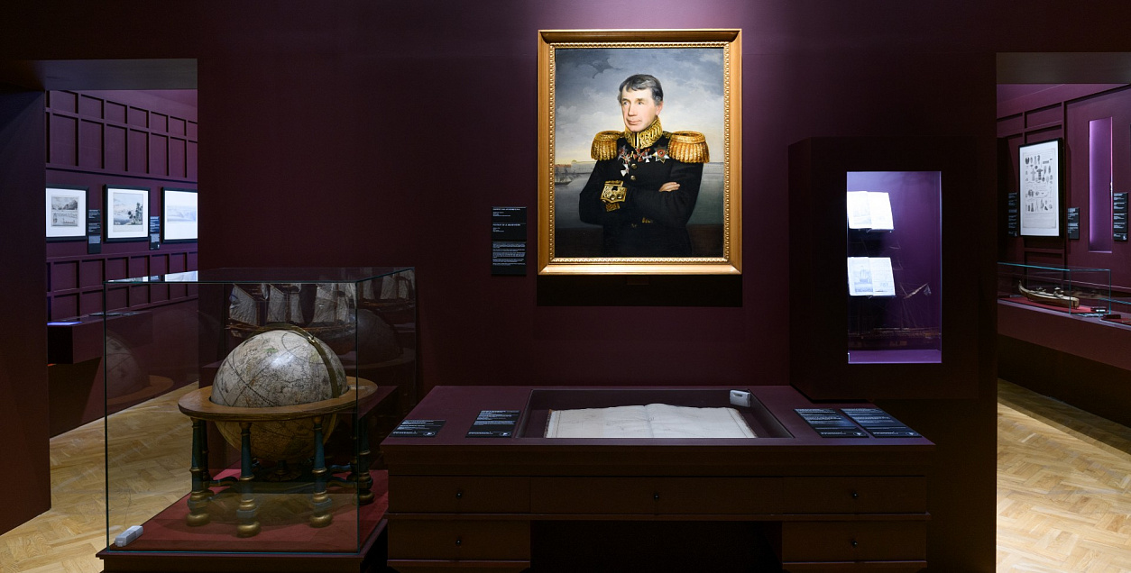 Под стеклом развернуты карты Александера Далримпла, считавшиеся в начале ХIХ века самыми надежными. На листе видны пометки, сделанные рукой Ивана Крузенштерна. Сам путешественник создал настолько точный «Атлас Южного моря», что им будут пользоваться вплоть до середины ХХ века. Также демонстрируется уникальный «Атлас карт и рисунков к путешествию вокруг света в 1803–1806 годах на 16-пушечном шлюпе „Надежда“ капитана И.Ф. Крузенштерна». В музее можно увидеть его личную подзорную трубу в деревянном корпусе, глобус, солнечные часы, секретер-шкатулку. В одном из разделов выставки собраны мемориальные предметы Ивана Федоровича. Среди них особый интерес представляет коллекция книг из личного собрания Крузенштерна и корабельной библиотеки шлюпа «Надежда».