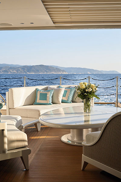 Углубление с рабочими механизмами на фордеке практически не заметно с носовой террасы, особенно если загорать на огромном лежаке, ориентированном по ходу судна, или сидеть на глубоком П-образном диване, сдвинутом еще дальше к надстройке. Мест для солнечных ванн и релаксации на этой яхте вообще очень много.