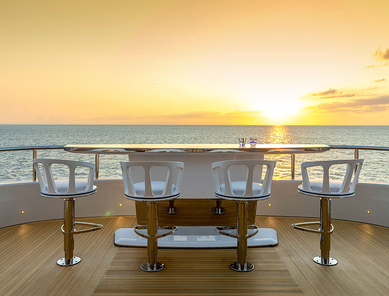 Десять гостей, на которых она рассчитана (среди опций, предлагаемых верфью, есть и вариант на 12 гостей), при желании могут вообще не пересекаться друг с другом на отдыхе: шезлонги установлены на сандеке (под козырьком здесь также размещены диванная зона, обеденный стол и барная стойка с видом прямо по курсу), большими диванными группами оборудованы главная и вторая палубы, да и на корме нижней палубы, где пляжный клуб, места для лежаков тоже предостаточно.