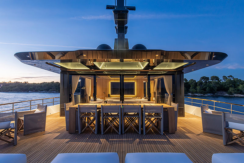 Верхняя палуба A96 скомпонована по принципу walkaround. Центр занимает надстройка с рубкой и скайлаунжем. Ее крыша образует широкие навесы над боковыми проходами и открытым пространством. Например, за надстройкой она выступает примерно на 2,5 м и дает достаточно тени, чтобы поставить кресла и кофейные столики. Как обычно у Arcadia, на крыше установлены солнечные батареи. Здесь их мощность превышает 45 кВт-ч, не говоря о том, что использованы наиболее передовые модификации панелей. Благодаря этому яхта может 8–9 часов идти в режиме тишины.