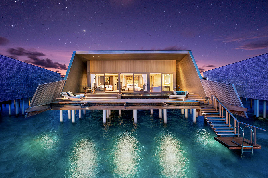 После обновления этим летом The St. Regis Maldives Vommuli Resort снова принимает гостей на уединенном атолле Дхаалу. Курорт настолько преобразился, что его можно считать совершенно новым. В основу концепции легли четыре зоны: лагуна, пляж, тропические заросли и береговая линия. Именно они вдохновляли архитекторов на создание уникальных пространств. Здесь нет привычных бунгало с соломенными крышами. Вместо них — виллы над водой, напоминающие скатов, построенные преимущественно из дерева. Главное здание, Vommuli House, выполнено в виде баньянового дерева и органично вписывается в пышную зелень острова. Бар Whale — это китовая акула, а библиотека похожа на закрученную раковину.