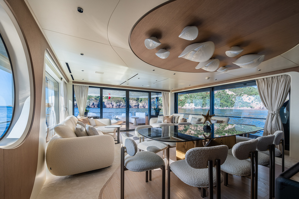 В главной гостиной, утопающей в солнечном свете благодаря огромным окнам, отражающие поверхности и зеркала визуально увеличивают пространство. Легкий морской бриз приносит с собой запахи и звуки моря, делая отдых на борту незабываемым.
