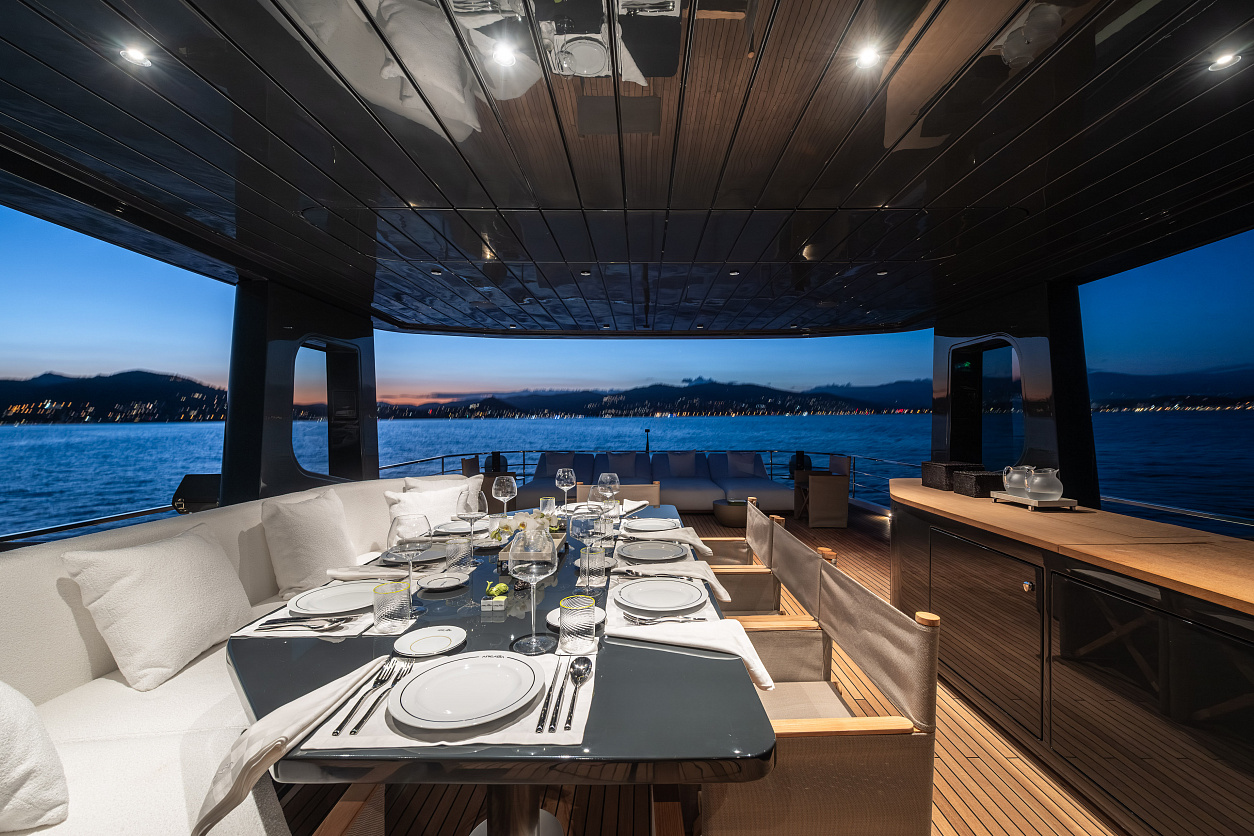 На просторной верхней палубе в 80 кв. м царит атмосфера свободы. В кормовой части устроена зона отдыха с мягкой модульной мебелью, будто созданная для неспешных бесед под ласковым солнцем. Чуть дальше, в тени элегантного хардтопа, расположена обеденная зона, где можно наслаждаться деликатесами на свежем воздухе. А спереди есть спрятанный от посторонних глаз уединенный уголок, готовый преобразиться по вашему желанию. Обеденно-диванная зона легко превращается в залитый солнцем солярий благодаря складному столику и мягкому тенту.