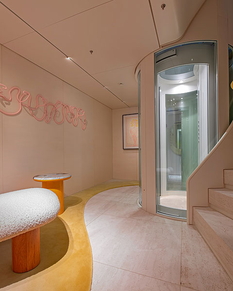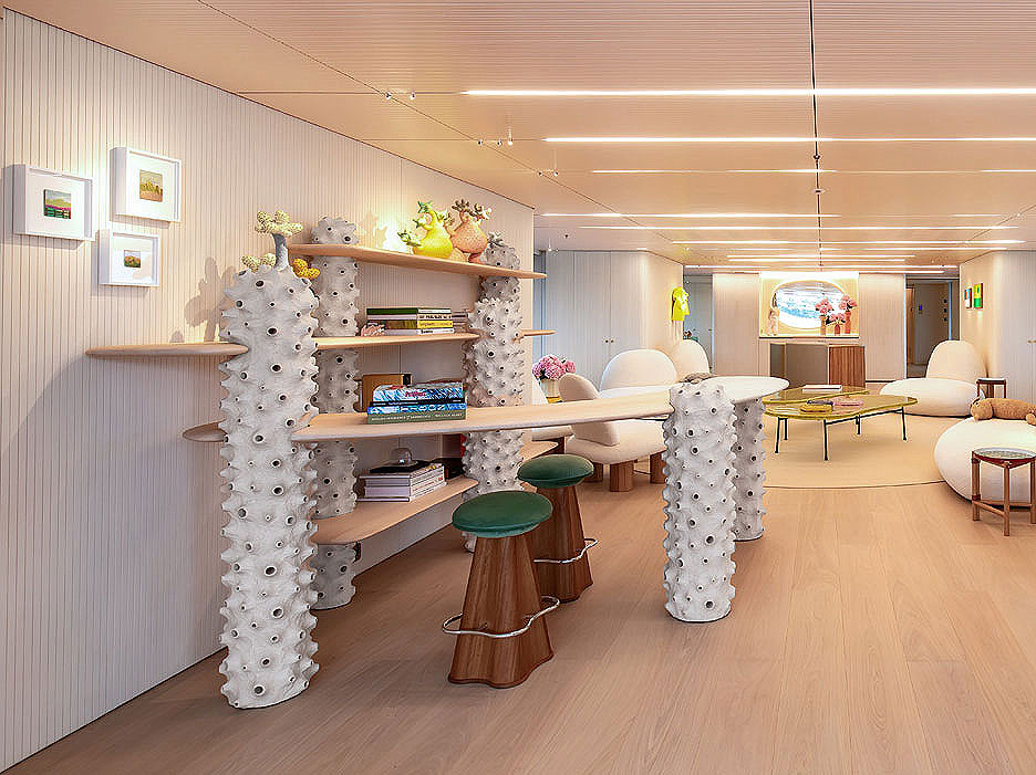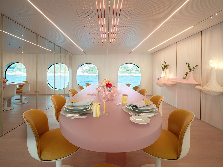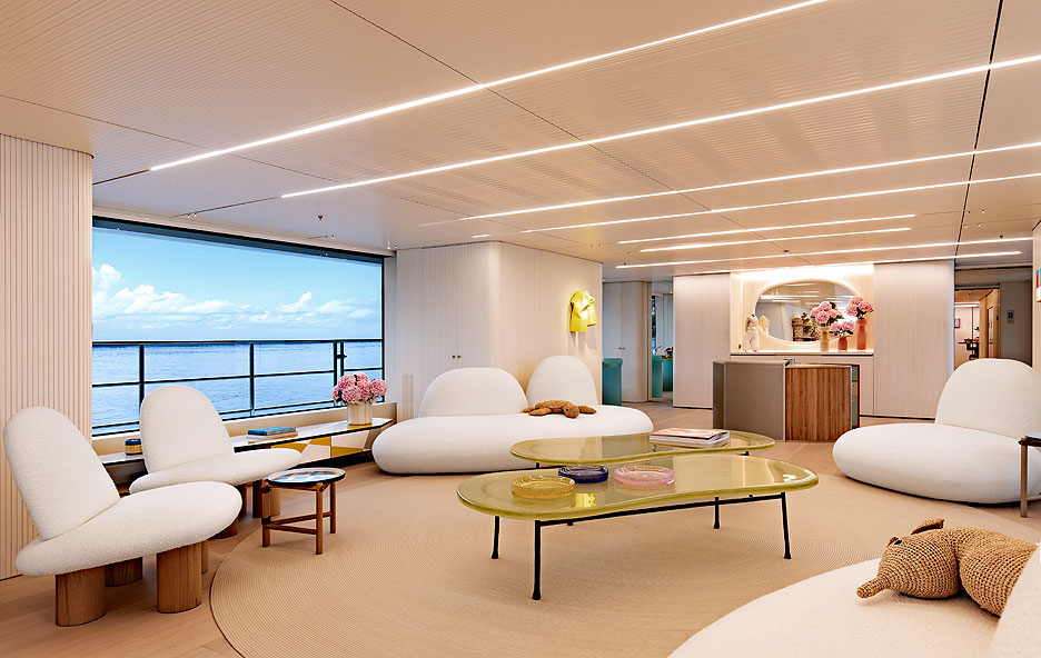 Вообще художественные отсылки, игры в ассоциации и смелые оформительские решения встречаются на Kasper 7 на каждом шагу. Взять, к примеру, столовую на главной палубе — именно ее украшают гигантские круглые иллюминаторы. Вдохновившись глазастыми персонажами картин художника Андре Бутцера, владелица изменила их абрис внутри: округлость частично обрезана настенным покрытием. Стол на 14 персон (автор — корейский скульптор Вонмин Пак) с толстой столешницей из розовой смолы похож на исполинскую конфету. Настенные консоли, выполняющие функции светильников и цветочных ваз, имеют настолько диковинные очертания, что смотрятся как бионические арт-объекты. Скульптурная стойка бара Sayar & Garibeh добавляет в интерьер вычурный завершающий штрих.