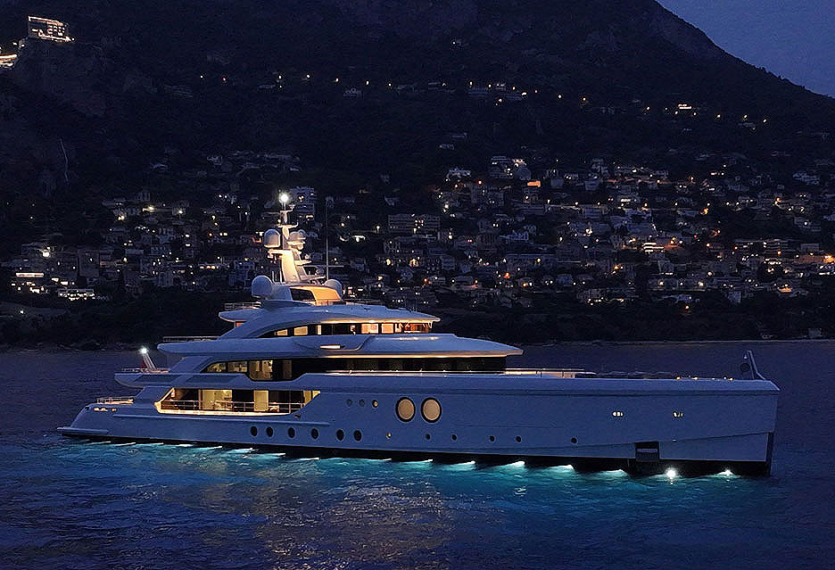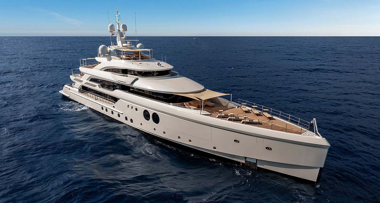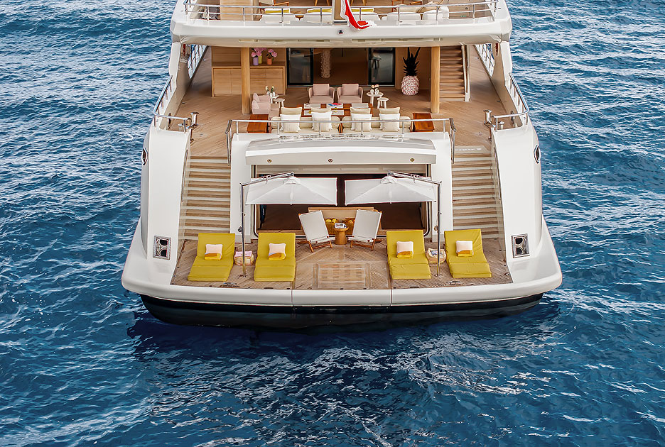 Наслаждаться морскими видами можно из диванной зоны кокпита, или спуститься оттуда к самой воде: за поднятой створкой транца находится пляжный клуб и спа (гараж для тендеров и гидроциклов вынесен в носовую часть), а стационарная кормовая платформа достаточно широка, чтобы расставить шезлонги. Для купания ее центральный фрагмент опускают под воду.