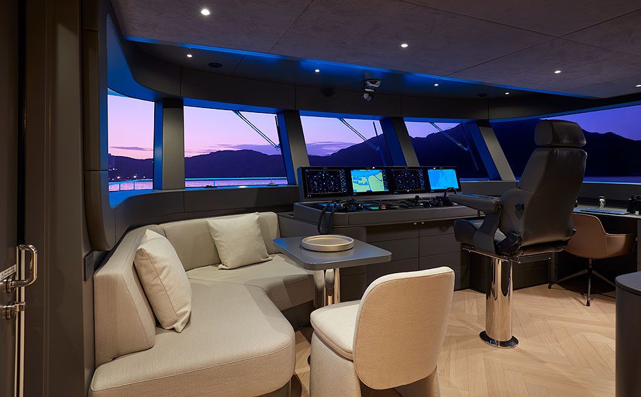 Рабочая и жилая зона для экипажа из пятерых человек занимает переднюю треть корпуса. Любопытная деталь: гардеробная в хозяйской каюте оснащена желобом, который ведет прямо в прачечную на нижней палубе.