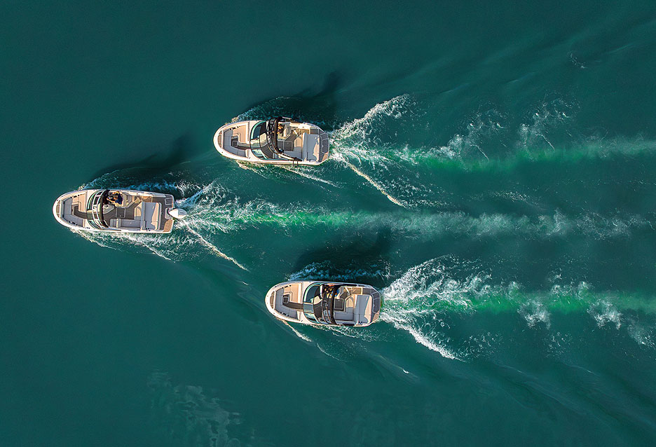 Customers can personalise their boat with a variety of optional packages. The Entertainment package includes four wireless charging stations, a transom remote control, and an upgraded audio system. The Comfort package features a bow table and filler cushion. The Starter package offers SeaDek flooring for the swim platform, bow and transom canopies, and a stylish two-tone exterior finish. The lighting package includes above-water LED lighting with colour-changing options and underwater lights.