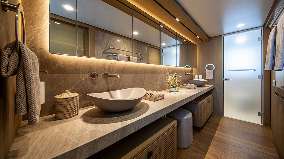 Два VIP’а и две двухместные каюты симметрично спланированы на нижней палубе. Три каюты экипажа в носовой части отделены от гостевых зон водонепроницаемой переборкой, гарантирующей приватность. Капитану достанется удобная каюта рядом с рулевой рубкой, с полноценным кабинетом для работы и отдыха.