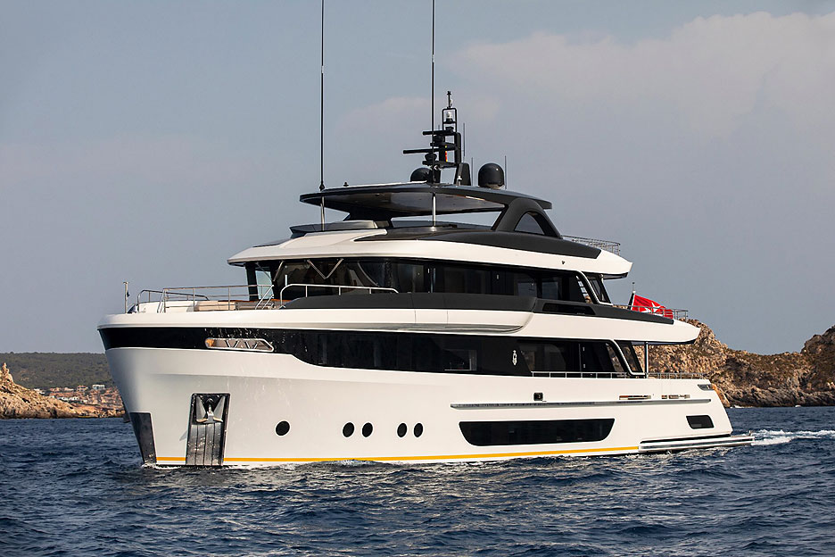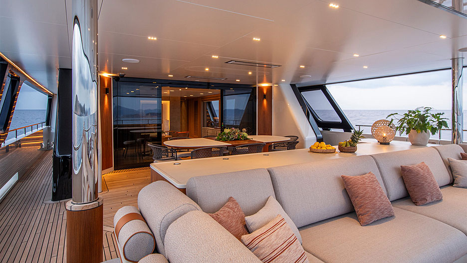 Купальная платформа может похвастаться погружной центральной частью и длинным телескопическим трапом, который выдвигается из правой лестницы, ведущей в кокпит. Удобно сходить с пирса прямо к главному салону. За транцевой панелью расположен пляжный клуб с сауной, баром, комодом, где можно хранить спортивное снаряжение, и большим свободным пространством, которое можно обустроить по своему вкусу.