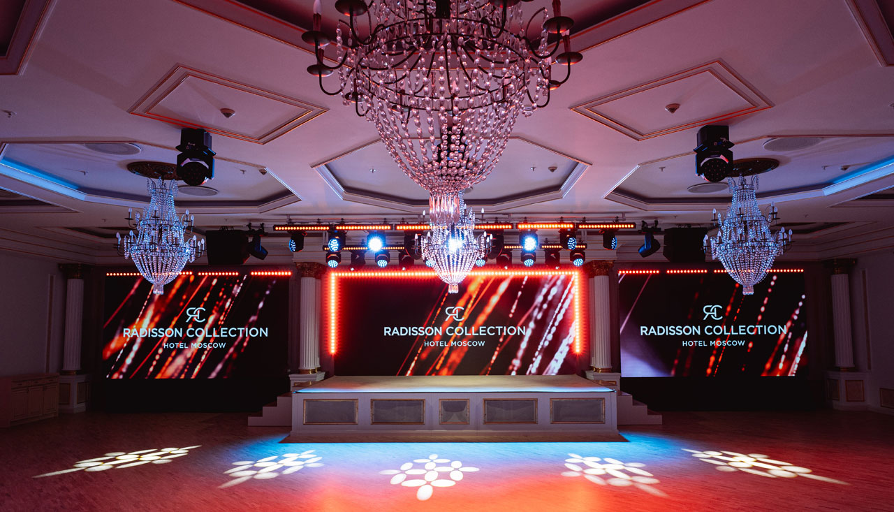 Смелый микс классики и современности можно реализовать теперь в Банкетном зале Radisson Collection Hotel, Moscow. 380-метровый зал популярного отеля оснастили до уровня мультимедийной студии: добавили еще больше профессионального света, LED экраны у сцены в длину достигают 15 метра при высоте 2,5 метра, а также появилась возможность установки дополнительных боковых экранов по 2,5 кв.метров. При этом в базе это по-прежнему Банкетный зал люксового отеля: антикварные люстры, премиальные столовая посуда и текстиль, ценный паркет из оливы и знаменитый кейтеринг от шеф-повара Александра Тинякова, носящего почетное звание «Лучший шеф-повар пятизвёздного отеля» по версии Russian Hospitality Awards.