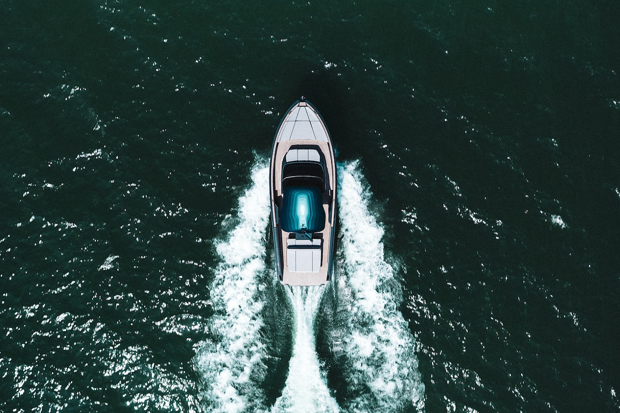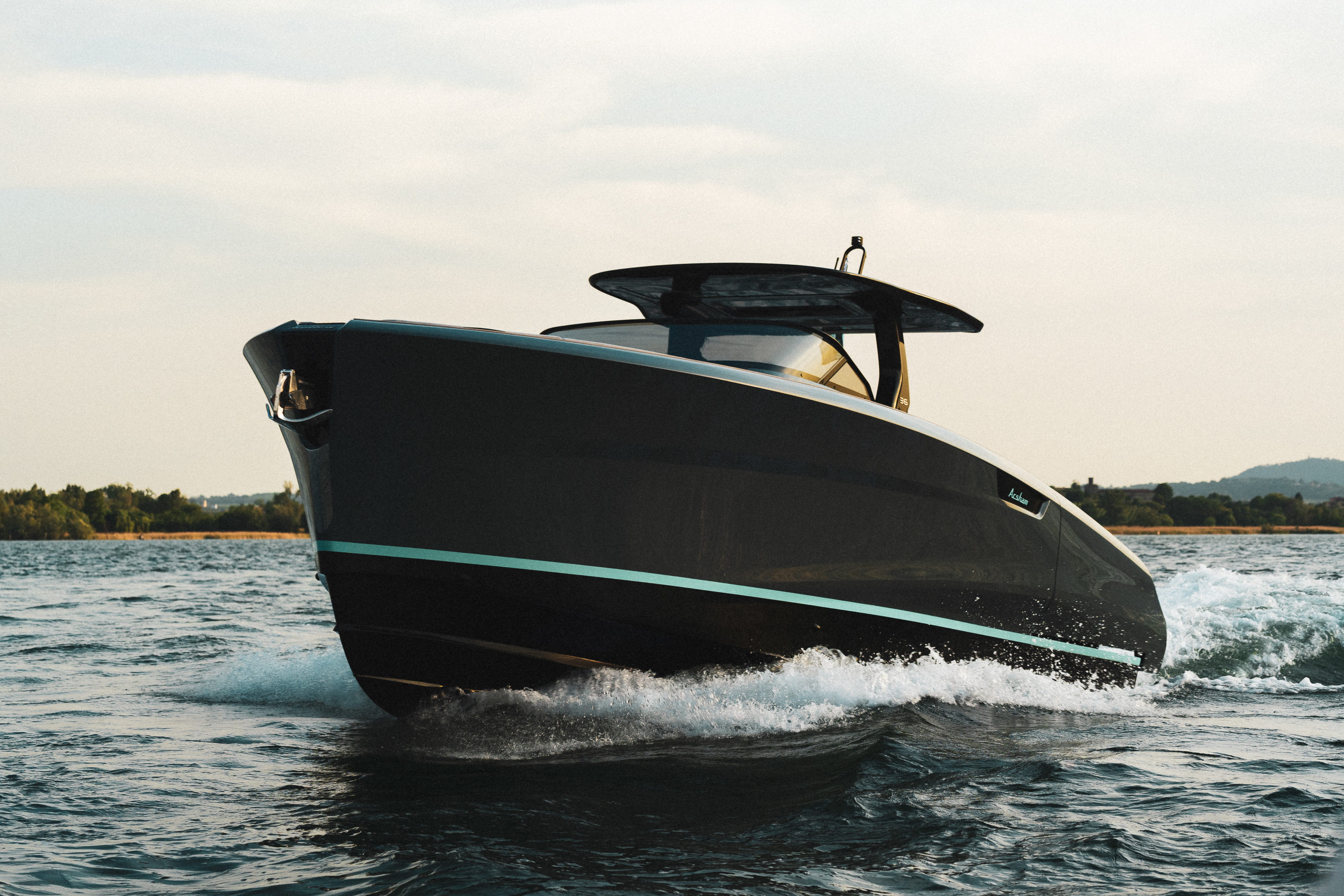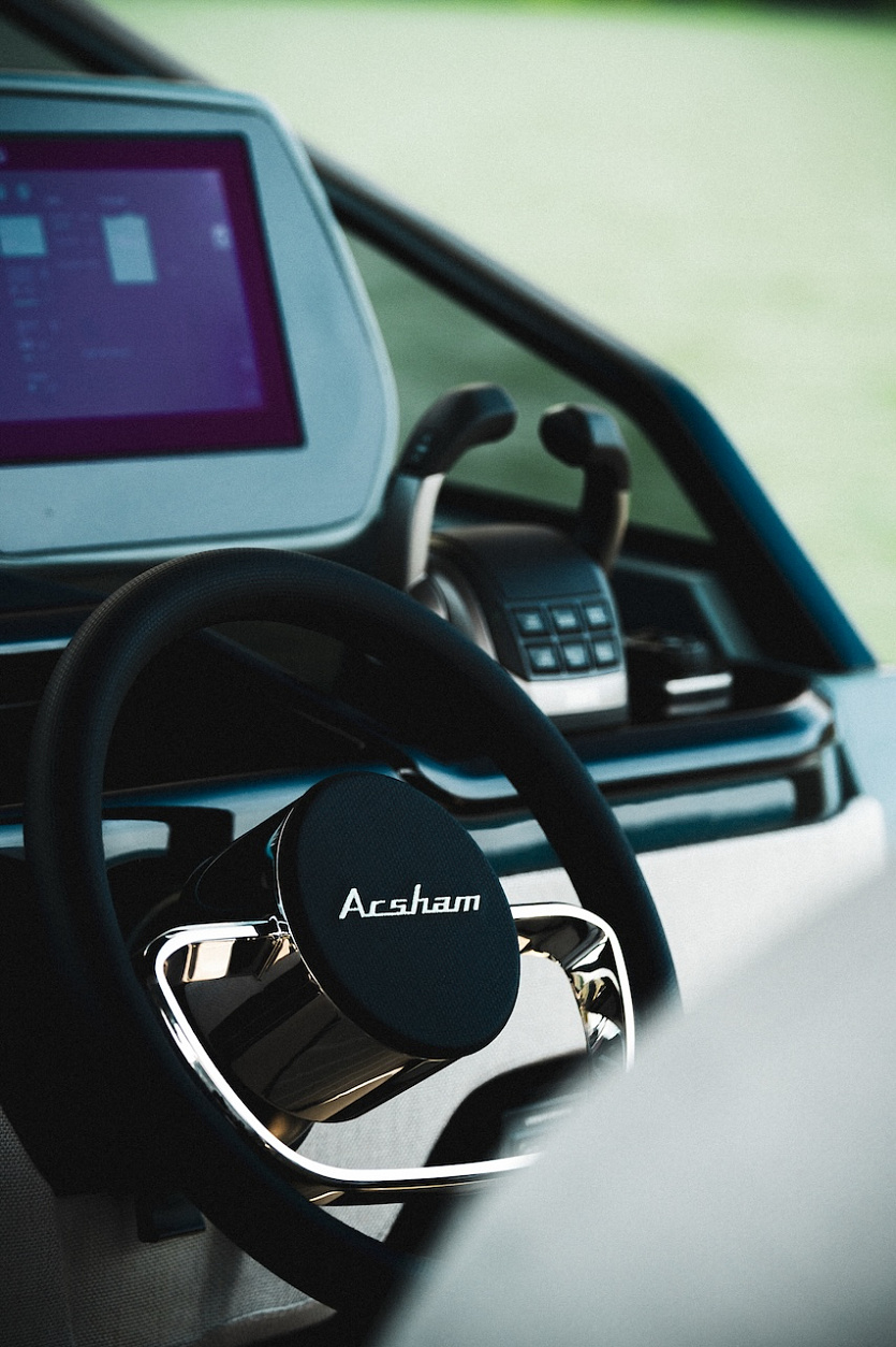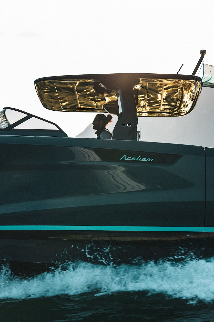 Моторная яхта длиной 11,3 м и шириной 3,9 м выделяется особой палитрой, в которой элегантные оттенки серого и черного дополняются фирменным зеленоватым оттенком морской волны от Аршама. Борта лодки украшены воздухозаборниками с индивидуальным дизайном и логотипом художника, также имеется хардтоп в характерном стиле и целый ряд деталей с монограммой мастера — сиденья, детали из искусственного тика, штурвал. Более того, интерфейс навигационной системы SIMRAD Chartplotter GPS 15 UltraWide также разработан в сотрудничестве с Arsham и Mònade Studio.