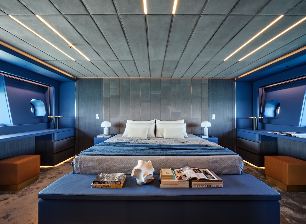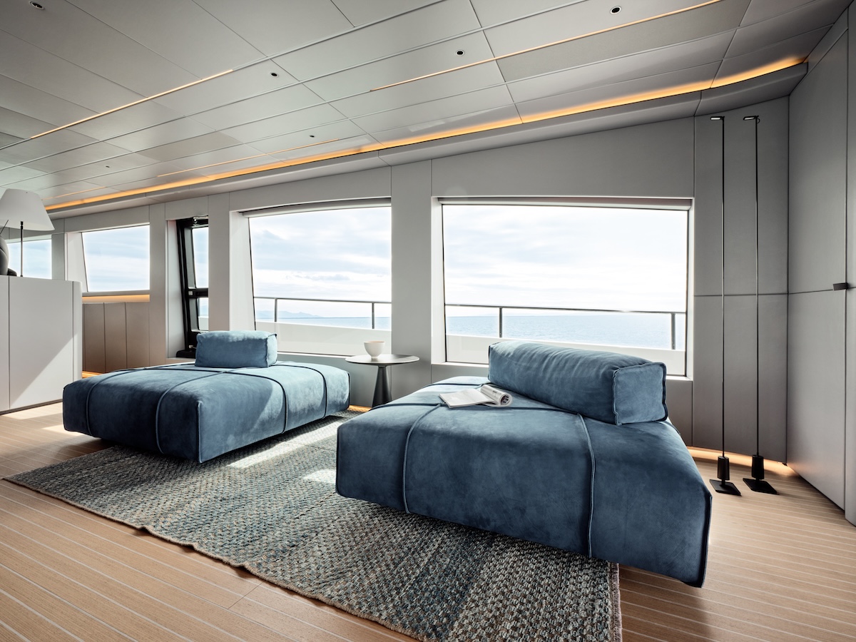 Designed by Archea Associati under the direction of Marco Casamonti, the yacht’s interior is reminiscent of a stylish loft, harmoniously blending light, lines, and details. The helm station is a technological and aesthetic marvel, featuring large touchscreen displays, lighting that changes color as speed increases, and ultra-lightweight thermal glass that helps maintain a cool interior while reducing strain on the air conditioning system.