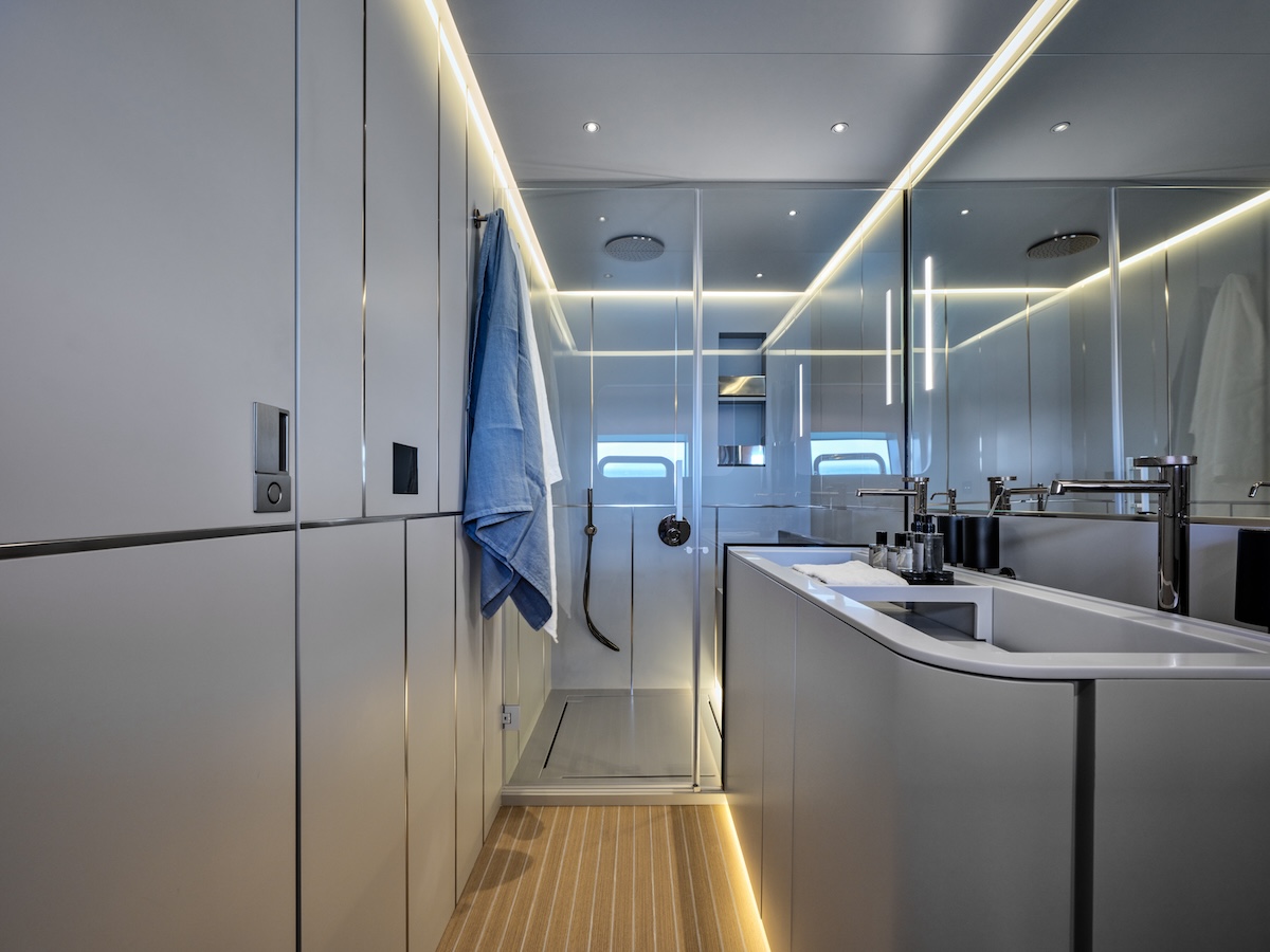 Below deck, the yacht features four cabins: a full-beam master suite amidships, a full-beam VIP cabin forward, and two guest cabins equipped with sliding beds that can be configured as either doubles or twins. On the first hull, the VIP cabin spans the full width of the yacht, like the master suite, but an alternative layout with the galley relocated to the lower deck is also available, which slightly reduces the size of the VIP cabin. Each cabin is equipped with an en-suite bathroom.