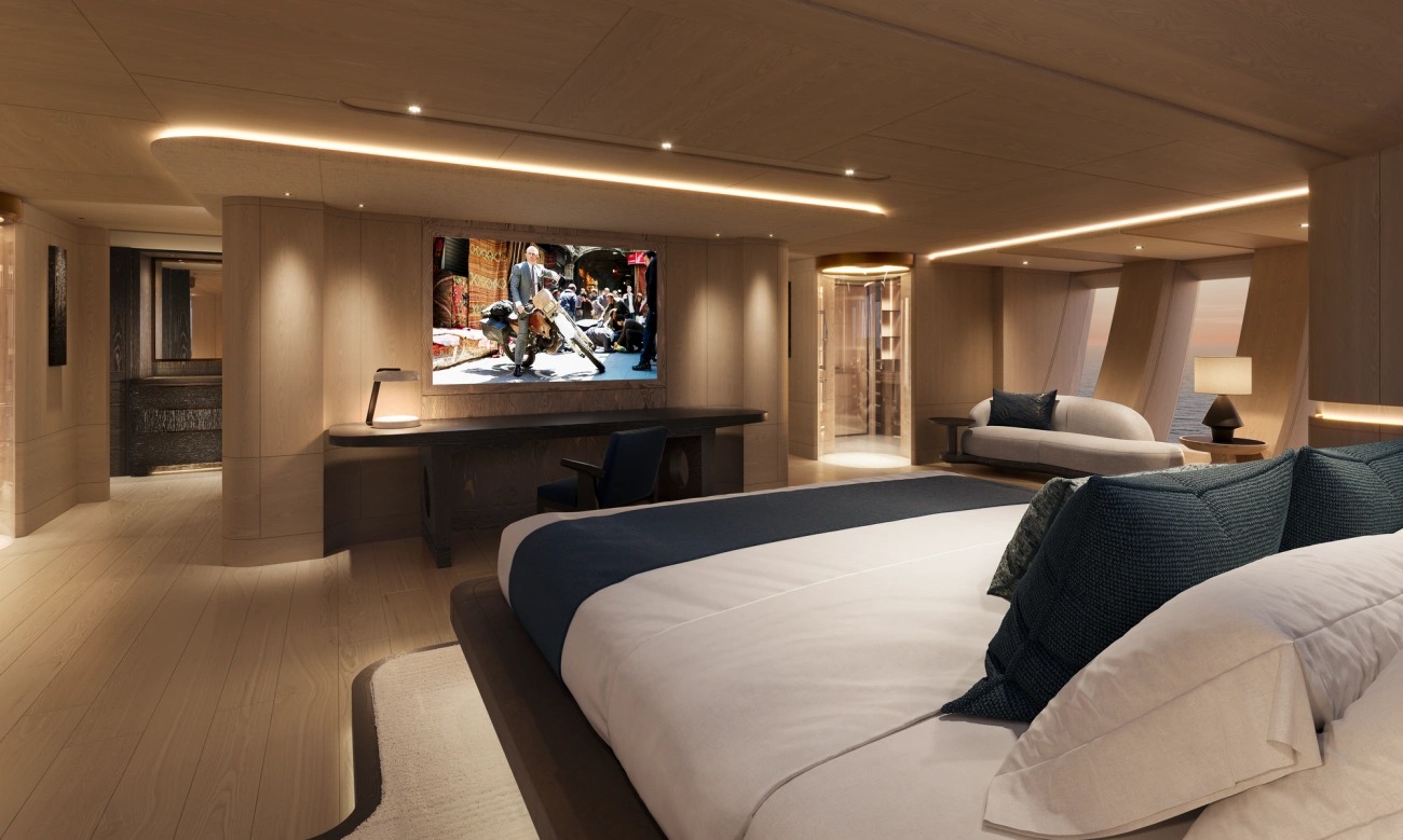 The spacious full-beam owner’s suite has direct access to the large aft beach deck. Oversized hull windows flood the space with natural light. Among the guest amenities are a midship wellness spa and a watersports center, ensuring a comfortable and enjoyable stay on board.