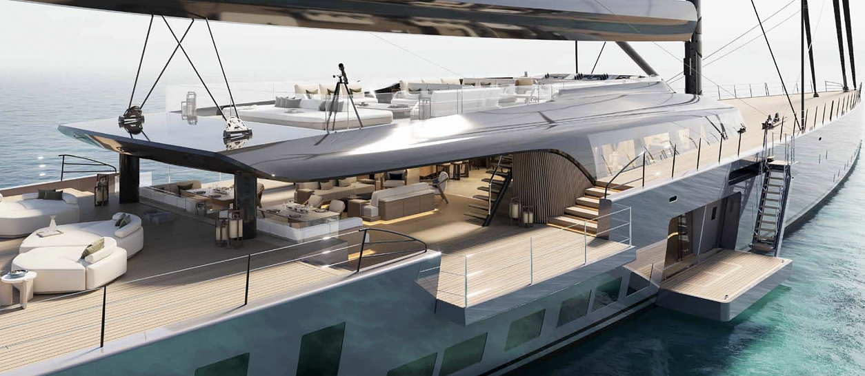 The rig of SKY will surpass the current world record by 4 meters (14 feet). The carbon mast, boom, and integrated sail handling system by Rondal will ensure effortless and safe sail management. Below deck, the yacht will accommodate a 12-meter (39-foot) tender, a crew/rescue tender, two jet skis, and an array of equipment for water and other sports, including seabobs, bicycles, SUP boards, kayaks, and diving gear. This extensive range of gear eliminates the need for a separate support vessel.