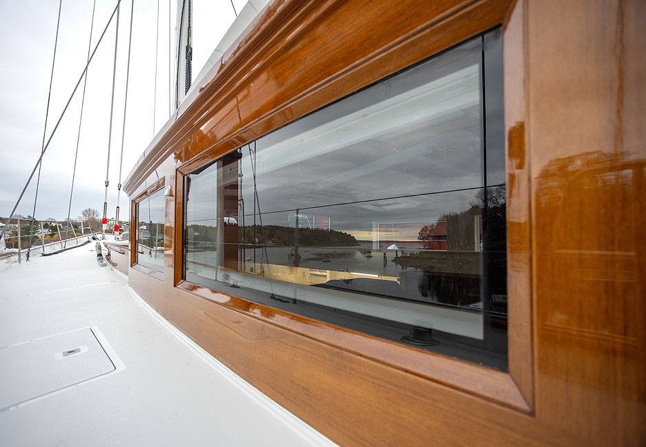Конек судостроителей из Новой Англии — работа с древесным композитом холодной формовки. Он обладает многими преимуществами стеклопластика по производительности и долговечности, но при этом сохраняет теплоту, красоту и даже аромат натурального дерева, устойчив к воздействиям влаги, погодных условий и времени. Материал поглощает вибрацию, делая ход судна плавным и тихим.