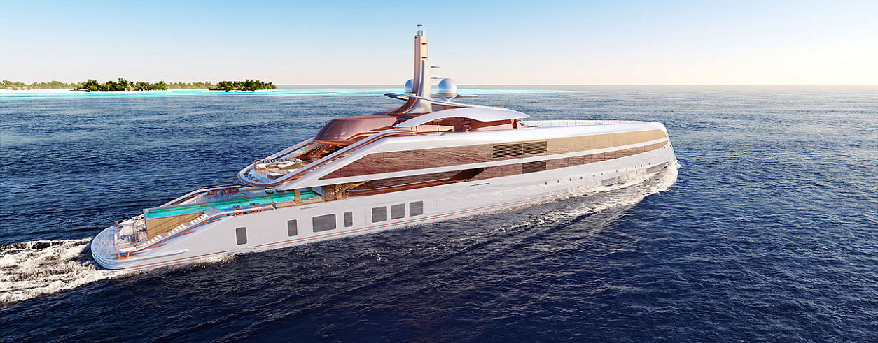 Среди главных особенностей яхты — 20-метровый бассейн, просторные палубы и множество индивидуальных дизайнерских элементов.