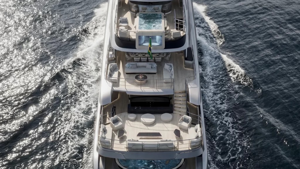 One of the yacht’s standout features is the so-called “people pad” – an overwater terrace positioned above the main deck aft. Designed as a separate open-air lounge, it features a double-sided bar serving both levels and effectively functions as a second sundeck, bringing the most open social area closer to the water.