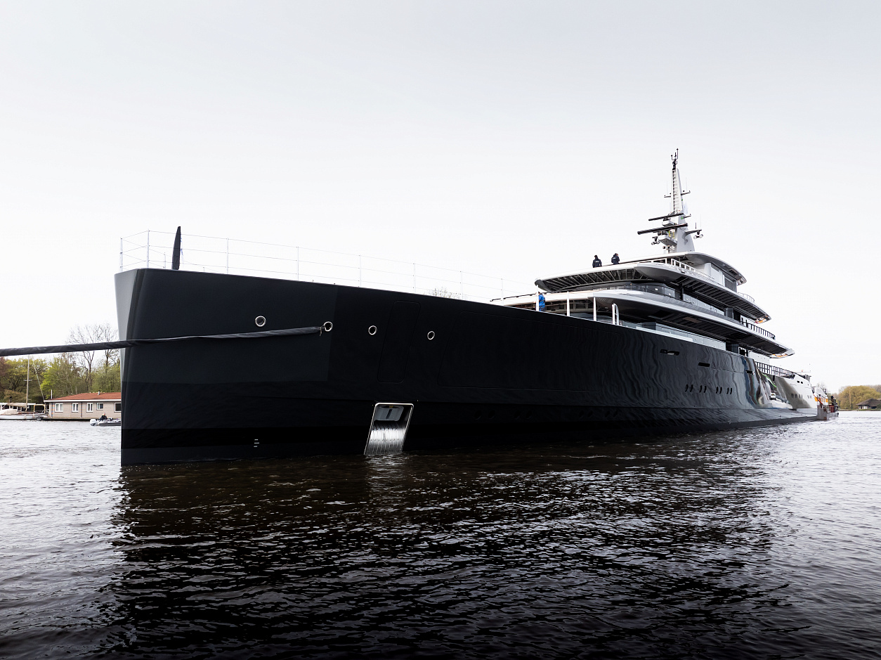 Чистоте профиля яхты способствуют плоские ресиверы Starlink – на мачте нет громоздких спутниковых куполов. Стальной корпус графитового оттенка сочетается с серебристой надстройкой из алюминия, которая словно парит над сплошными стеклянными стенами от пола до потолка. Глянцевые чёрные акцентные панели, «тёплые» тиковые палубы и вертикальные тиковые полосы создают особую «подпись» яхты. Плавные изгибы окон и скульптурные козырьки переходят в просторные зоны для отдыха на облицованной тиком корме, «водопадом» спускающейся к морю. Основная и верхняя палубы с проходами по кругу обеспечивают беспрепятственное движение от носа до кормы. Современный, но тёплый интерьер — работа миланской студии m2atelier.
